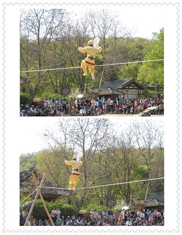 ▼民俗村內正好有表演,表演者身手矯健的在繩索上跳上跳下